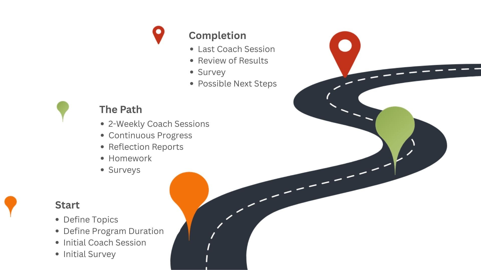 Depending on the number of topics you want to be coached on, this typically lasts between 5 and 8 months.
